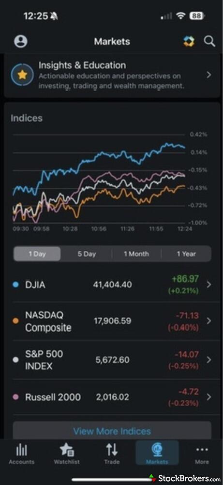 Charting on mobile is solid with either provider, including landscape mode, multiple time frames, after-hours charting, and the ability to compare stocks on the same chart. The key split is the number of technical studies available—Schwab’s 373 versus Interactive Brokers’ 97—which can sway traders who lean heavily on indicators.