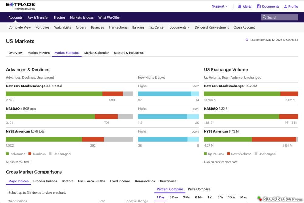 Charting and tools tilt toward TradeStation. It offers 294 technical indicators (E*TRADE: 121), 45 drawing tools (E*TRADE: 37), and 341 watchlist columns (E*TRADE: 43). Editing studies is more flexible too (12 SMA fields vs. E*TRADE’s 8), and only TradeStation lets you create custom studies. That said, both brokers let you add notes, show historical trades, display corporate events, set custom date ranges, run automated chart pattern analysis, and save multiple chart profiles.