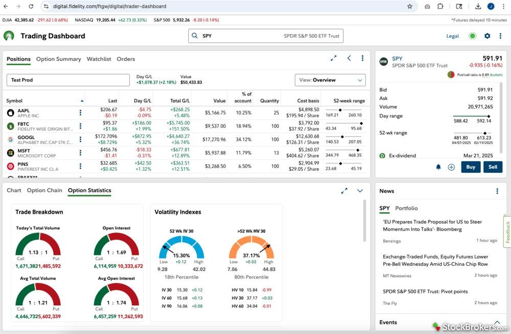 Platform access is a draw: each broker offers downloadable desktop software for Windows and Mac, as well as a browser-based platform. Both let you adjust open orders directly on charts and save multiple chart layouts. The clearest workflow differences are simulation and journaling—TradeStation supports paper trading while Fidelity does not; Fidelity includes a trading journal while TradeStation does not. For organizing symbols, TradeStation provides many more watchlist columns (341 vs 92), which helps with detailed views and filtering, while Fidelity keeps lists simpler.