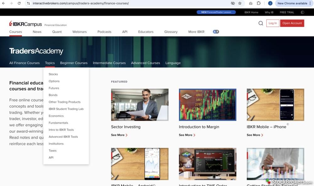 Interactive Brokers and Firstrade both teach the basics, offering stock and options education along with educational videos and webinars. Interactive Brokers goes further with lessons on ETFs, mutual funds, and bonds, plus paper trading to practice with virtual money. It also adds quizzes and the ability to track your learning progress—features Firstrade does not include. Firstrade does not cover ETFs, mutual funds, or bonds, and it lacks paper trading, quizzes, and progress tracking.