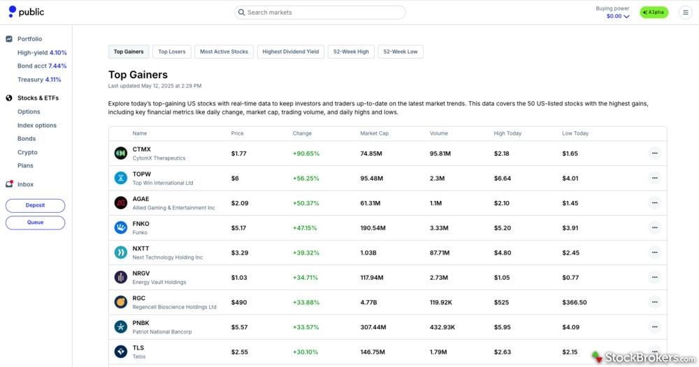 Bottom line: both Robinhood and Public.com deliver basic market research, but Robinhood holds a slight edge. Each is rated 2.5 out of 5 stars; in StockBrokers.com’s rankings, Robinhood places #10 of 14 while Public.com is #12. The difference comes from tools: Robinhood lets you view portfolio allocation by asset class and includes a stock screener for trade ideas, advantages Public.com doesn’t match.